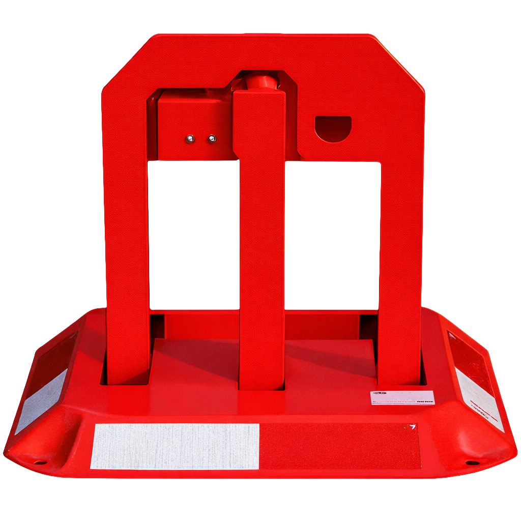 TSBP-05 to składana blokada parkingowa z zamkiem na klucz. Ma automatyczny zatrzask – do otwarcia wystarczy ją rozłożyć (bez użycia klucza); do zamknięcia używasz klucza.