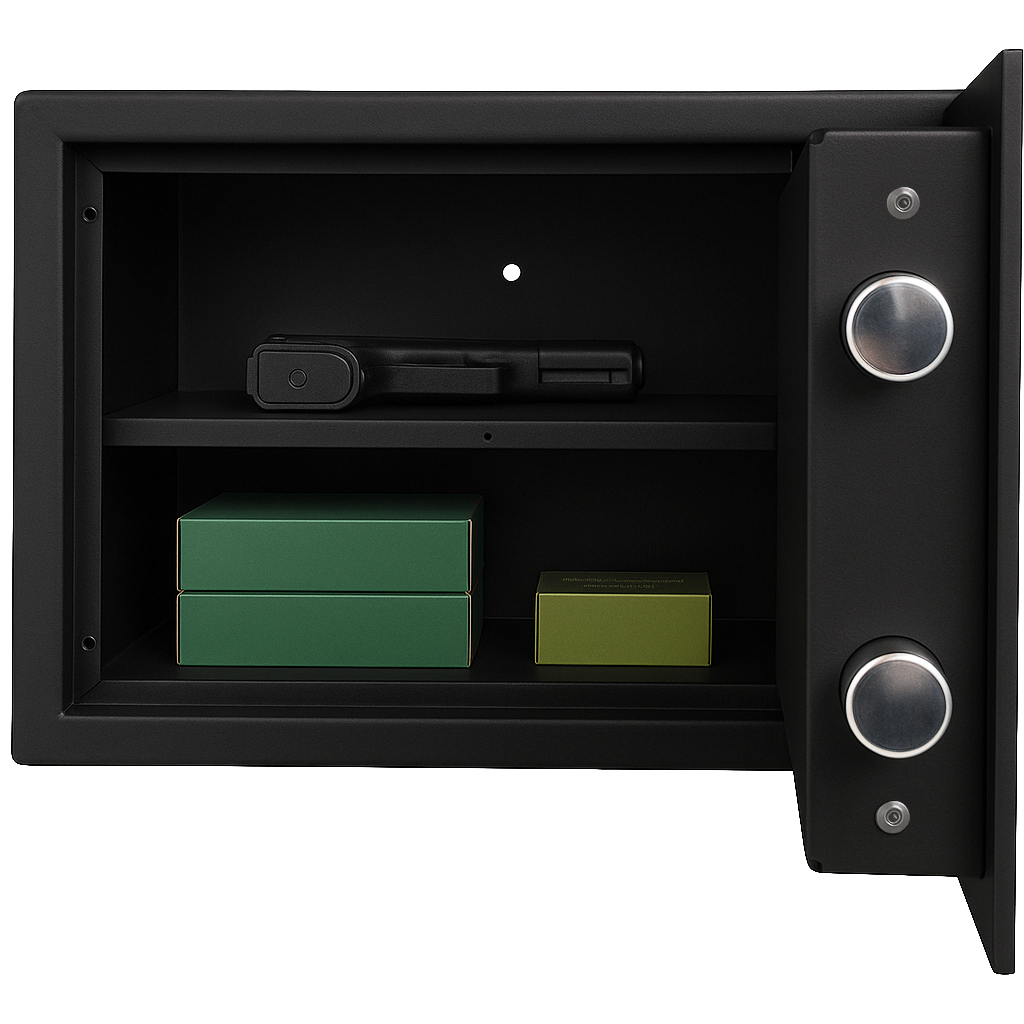 Wnętrze 24,4 × 33,4 × 22,4 cm (wys. × szer. × gł.) mieści dokumenty A4 na płasko, broń krótką z akcesoriami, gotówkę, biżuterię, nośniki danych i drobną elektronikę.