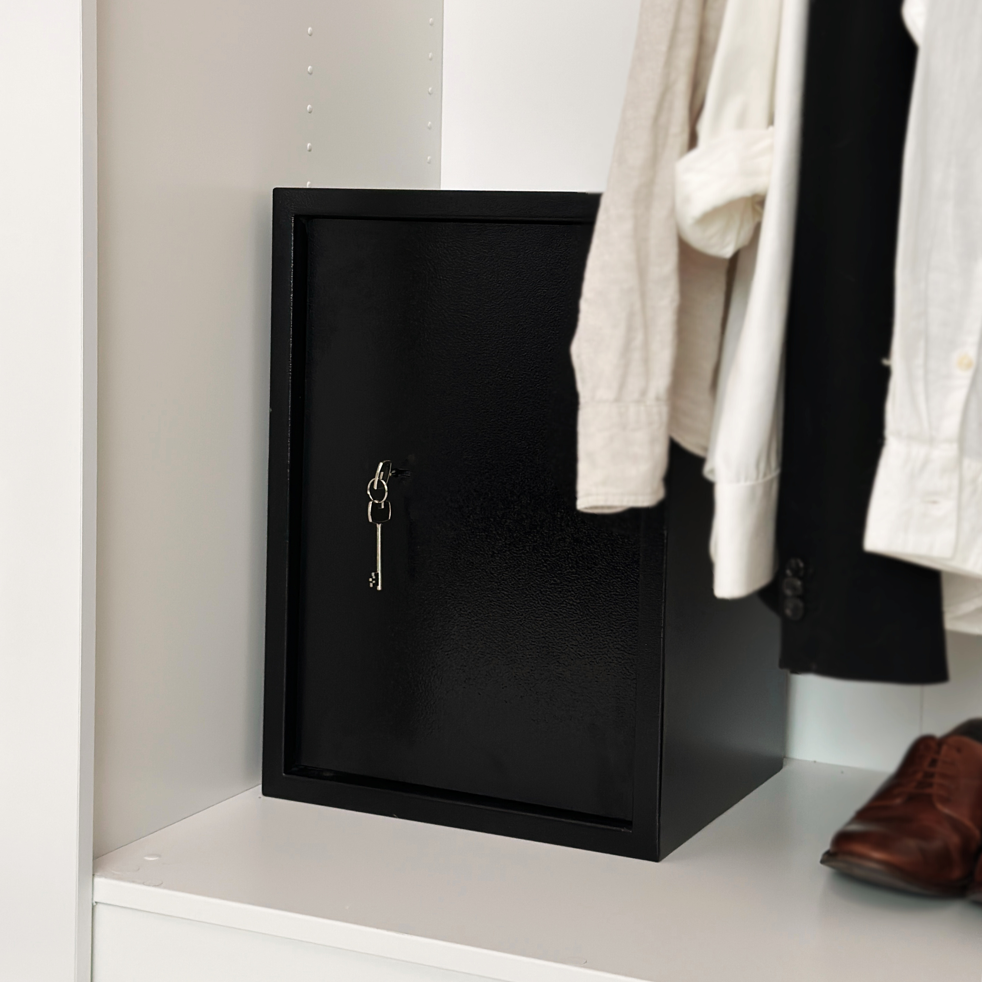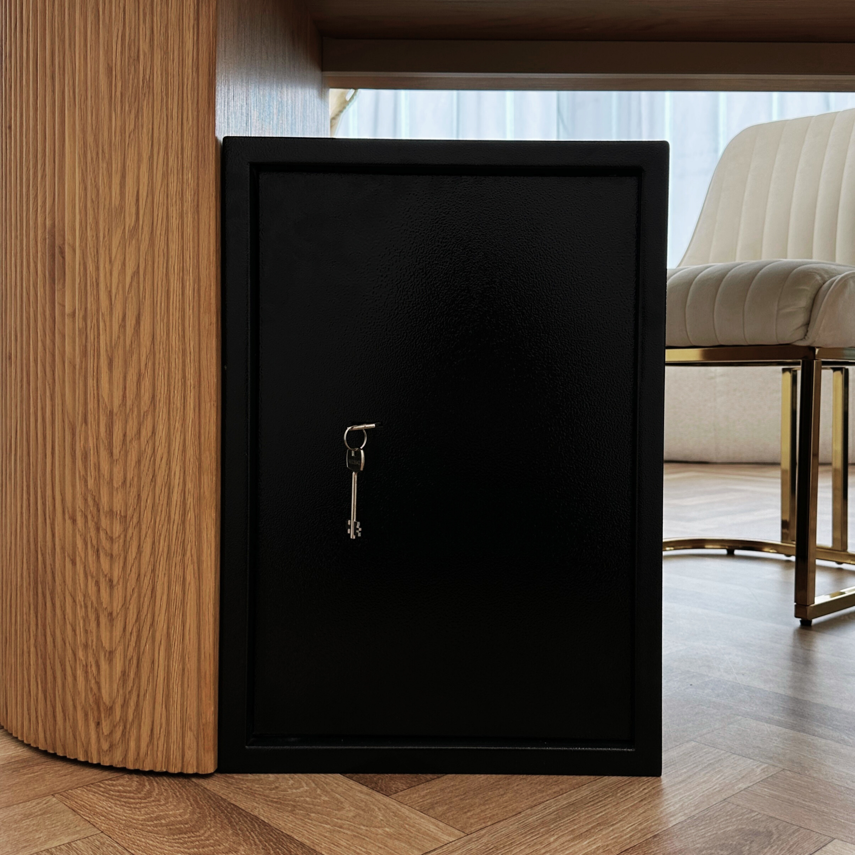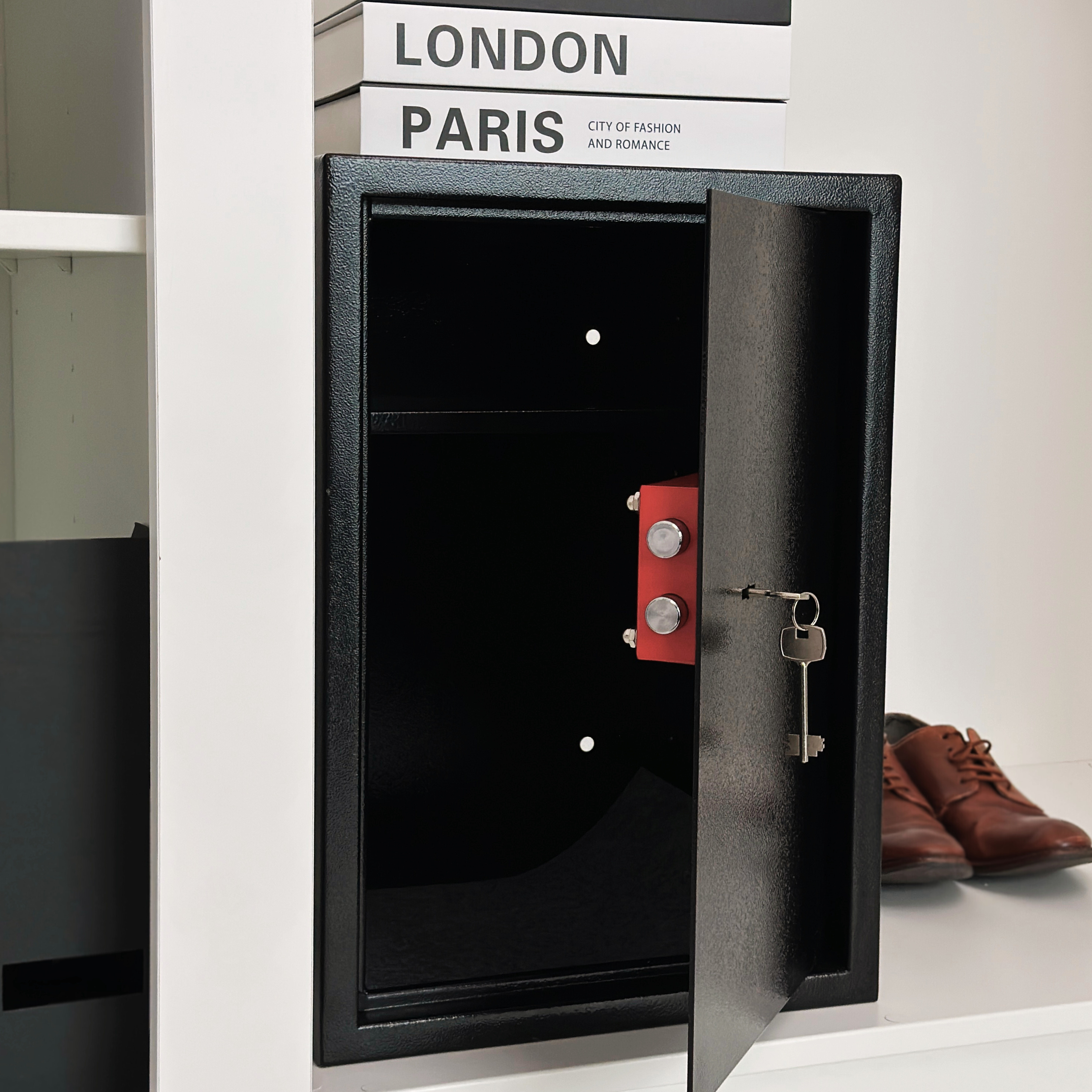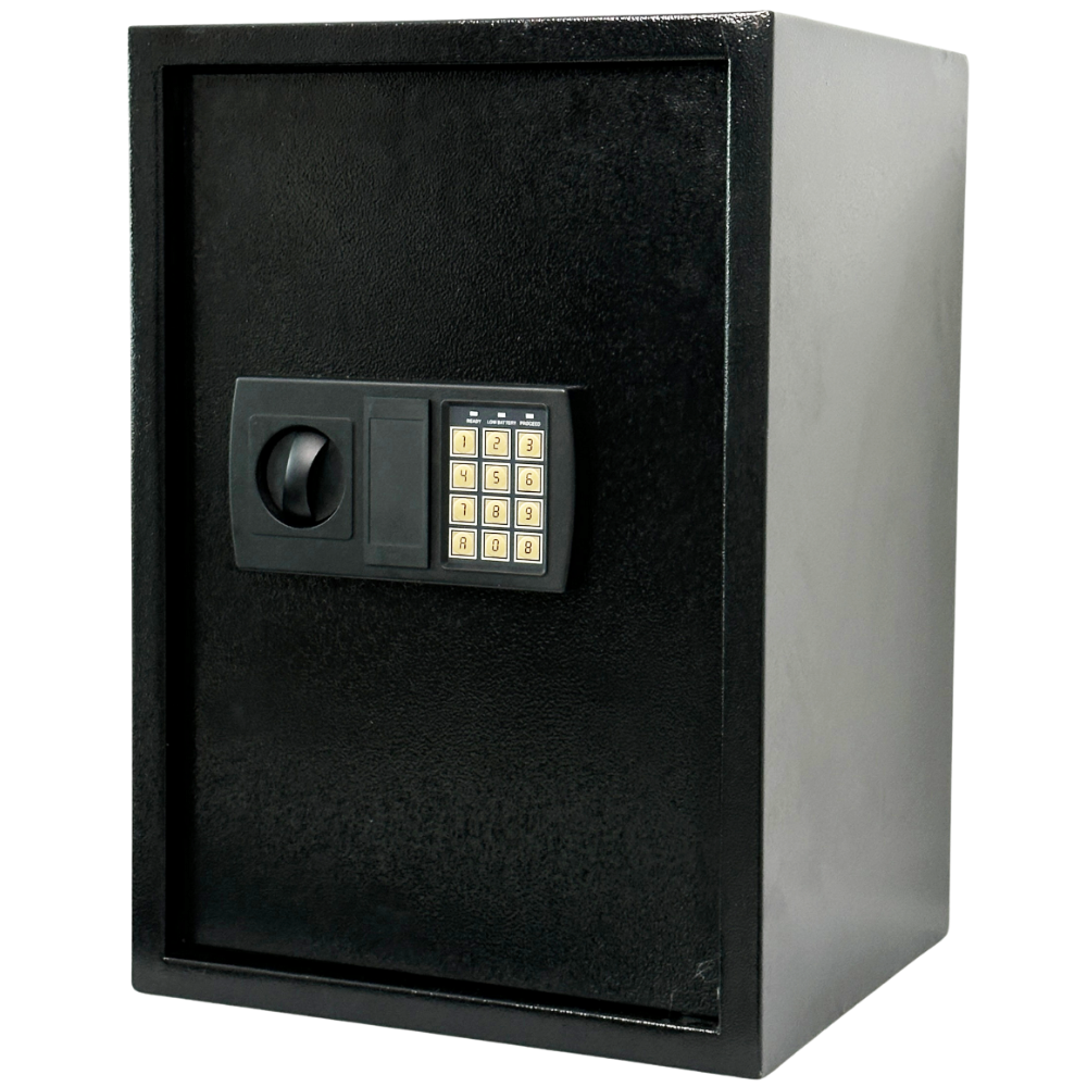 Profesjonalny charakter – czerń i prosta bryła sprawiają, że sejf dyskretnie wpasuje się w przestrzeń biurową lub domową.