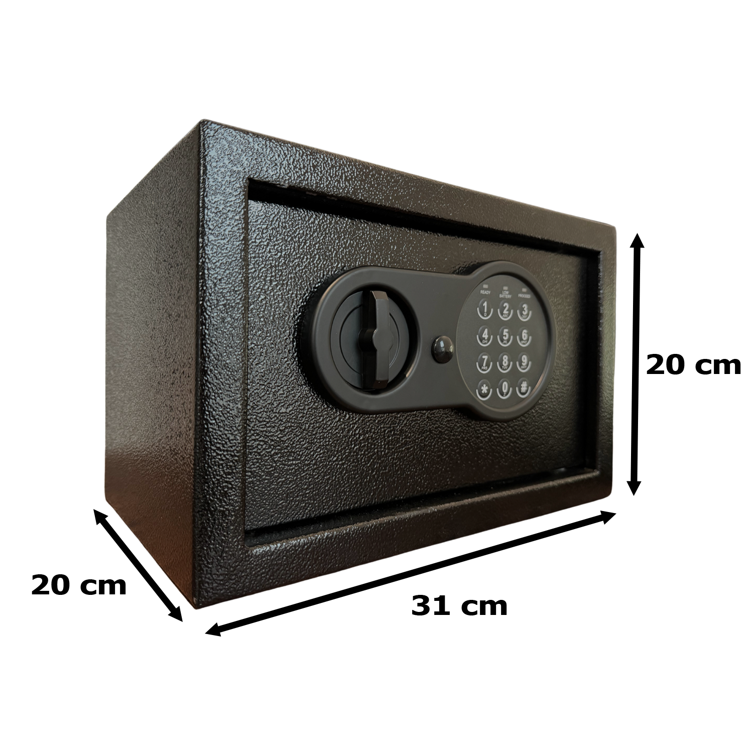 Wnętrze ok. 19,4 × 30,4 × 19,4 cm (11,5 L) pomieści gotówkę, biżuterię, dokumenty w mniejszych formatach, nośniki danych, portfel/cold wallet i drobną elektronikę. Kartka A4 (21 × 29,7 cm) nie wejdzie na płasko ze względu na wysokość 19,4 cm.
