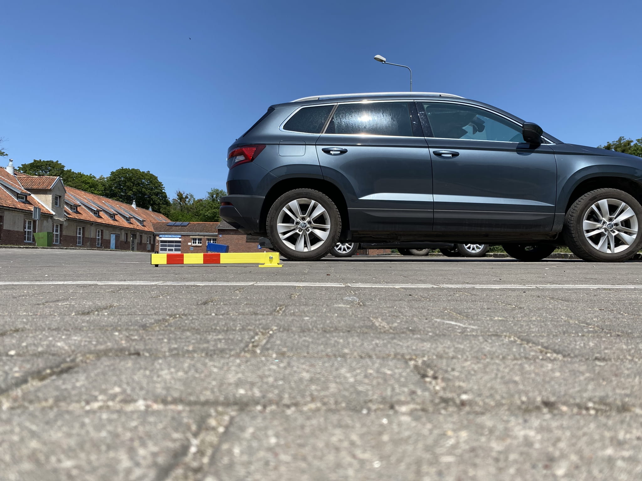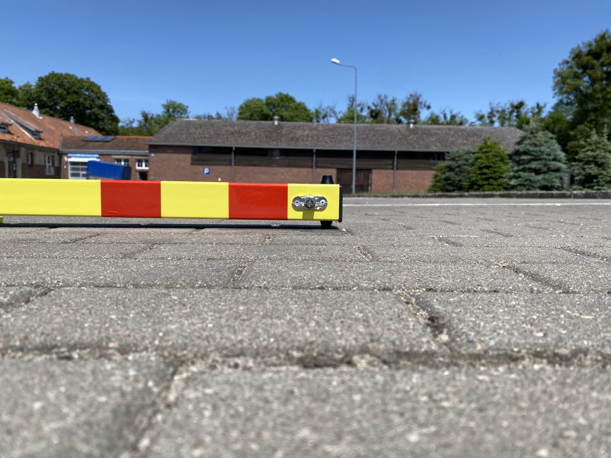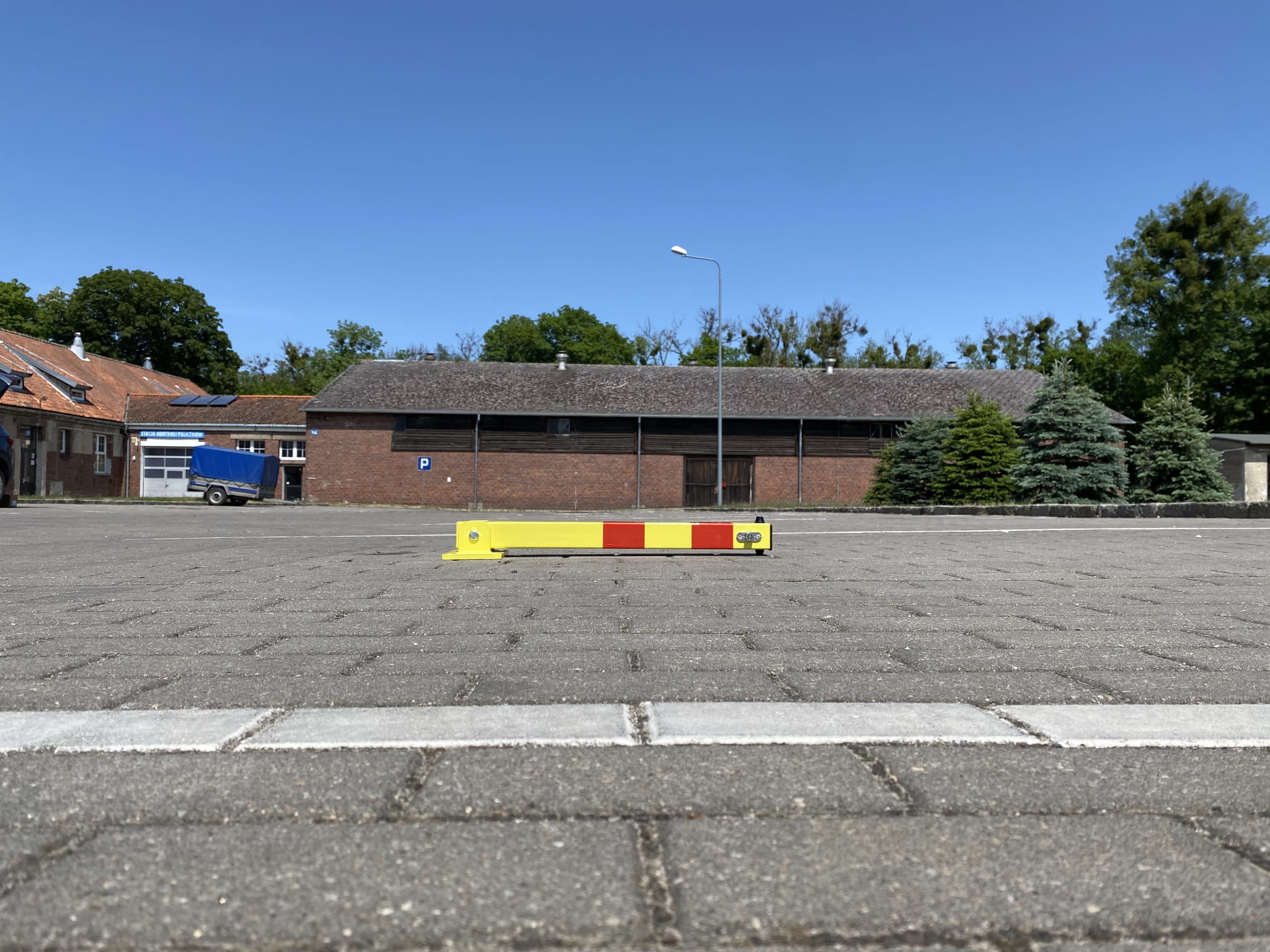 Wytrzymała konstrukcja: Słupek wykonano z solidnej stali malowanej proszkowo, co zapewnia jego wysoką odporność na uszkodzenia mechaniczne. Po złożeniu słupek leży płasko na ziemi, opierając się o gumowe odbojniki, które chronią go przed uszkodzeniami.