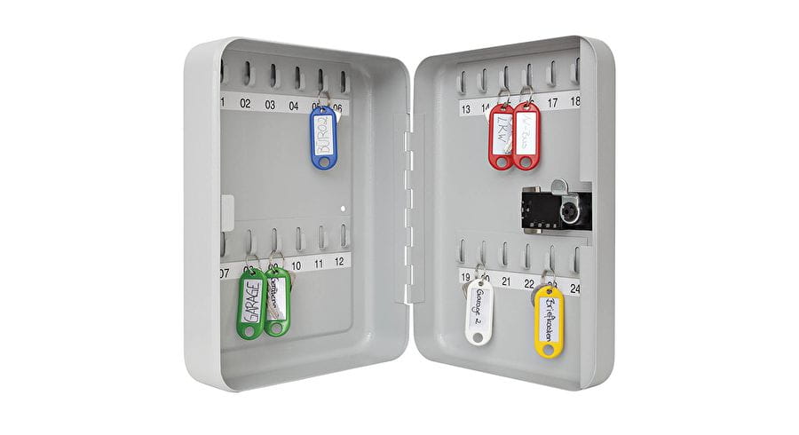 Pojemność i organizacja: Dzięki dużej pojemności, szafka pomieści aż 20 kompletów kluczy. W zestawie znajdziesz 20 różnokolorowych breloczków z etykietami, co pozwala na łatwe sortowanie i szybką identyfikację poszczególnych kluczy. Dodatkowe naklejki z numerkami pomagają w prowadzeniu ewidencji.