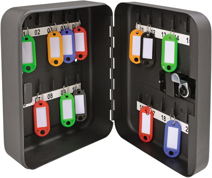 Pojemność i organizacja: Dzięki dużej pojemności, szafka pomieści aż 20 kompletów kluczy. W zestawie znajdziesz 20 różnokolorowych breloczków z etykietami, co pozwala na łatwe sortowanie i szybką identyfikację poszczególnych kluczy. Dodatkowe naklejki z numerkami pomagają w prowadzeniu ewidencji.