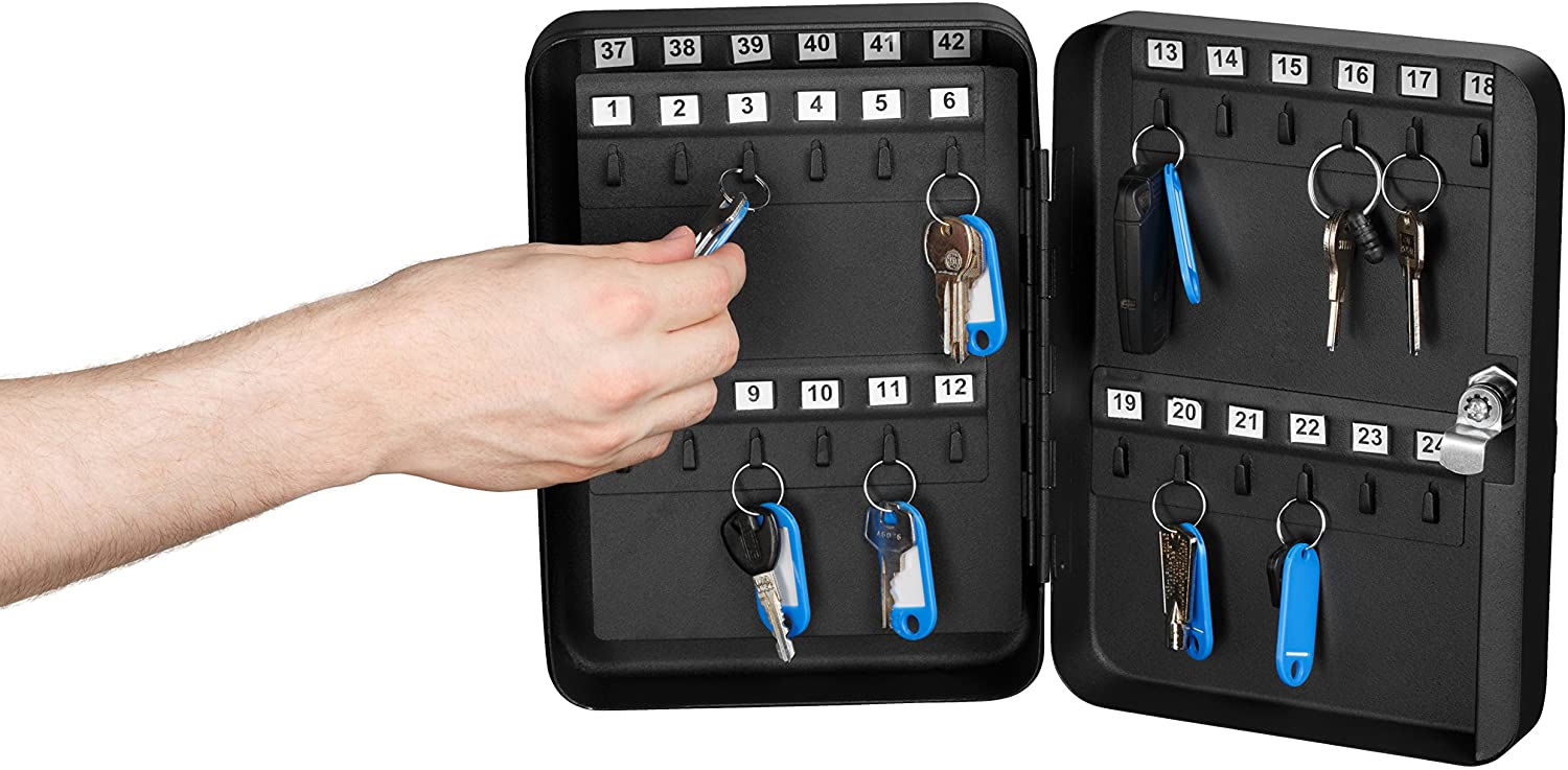 Pojemność i organizacja: Dzięki dużej pojemności, szafka pomieści aż 48 kompletów kluczy. W zestawie znajdziesz 48 różnokolorowych breloczków z etykietami, co pozwala na łatwe sortowanie i szybką identyfikację poszczególnych kluczy. Dodatkowe naklejki z numerkami pomagają w prowadzeniu ewidencji.